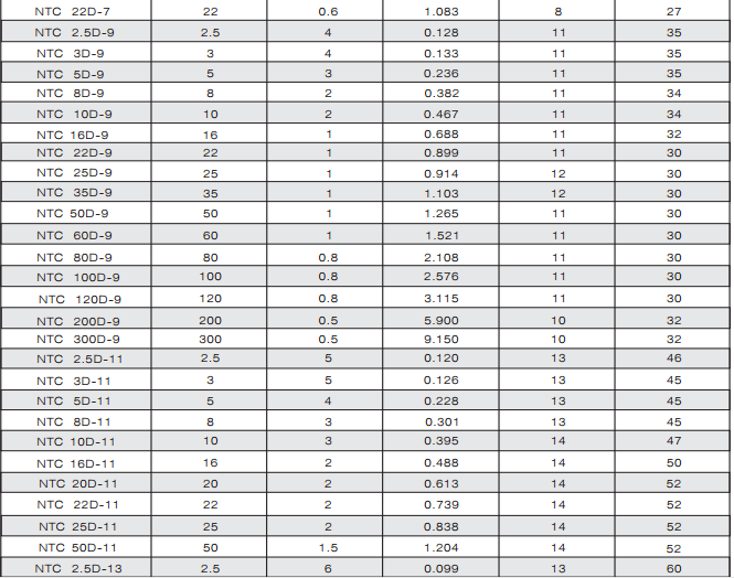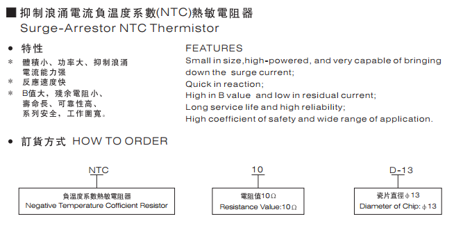 NTC熱敏電阻器:是以錳、鈷、鎳和銅等金屬氧化物為主要材料,采用陶瓷工藝制造而成的。NTC熱敏電阻器在室溫下的變化范圍在10°歐姆~10⒍歐姆,溫度系數(shù)-2%~-6.5%。它具有電阻值隨溫度的上升而下降的特性。適用于轉(zhuǎn)換電源、開關(guān)電源、UPS電源、各類電加熱器、電子節(jié)能燈、電子鎮(zhèn)流器、各種電子裝置電源電路的保護以及彩色顯示管、白熾燈及其他照明燈具的燈絲保護。