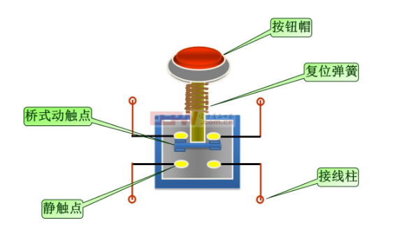 按鈕一般由按鈕帽、復(fù)位彈簧、橋式動(dòng)觸頭、靜觸頭、支柱連桿及外殼等部分組成。