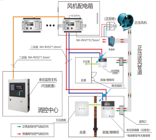 2, 余壓監(jiān)控系統(tǒng)通過余壓探測器實(shí)時監(jiān)測余壓值(前室/走道或樓梯間/走道氣壓差值), 當(dāng)余壓值超過報(bào)警設(shè)定值(前室30Pa, 樓梯間50Pa),余壓探測器將發(fā)出報(bào)警信號,同時聯(lián)動余壓控制器控制旁通閥開啟,減少正壓風(fēng)機(jī)前室或樓梯間的送風(fēng)量,降低前室或樓梯間余壓值。
