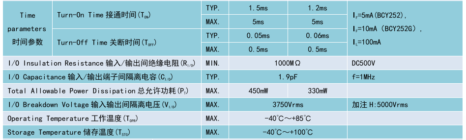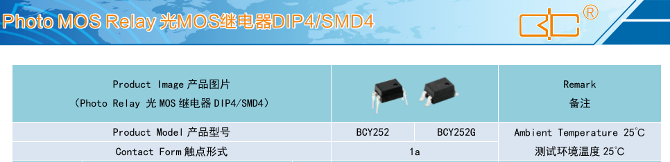 (Relay 光 MOS 繼電器 DIP4/SMD4),Product Model產(chǎn)品型號(hào):BCY252、BCY252G,Contact Form 觸點(diǎn)形式:1a,Ambient Temperature 25°C測(cè)試環(huán)境溫度 25℃