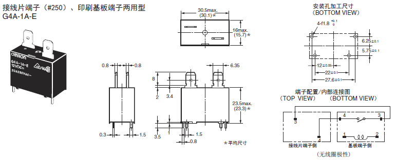 G4A 功率繼電器 實現通電80A、通電、切斷20A的1極小型功率繼電器 ? 實現通電80A、通電、切斷20A的電機負載開閉。小型卻可以實現高容量開閉、高耐久性。 ? 符合UL、CSA空調規格,確保絕緣距離。 ? 采用抗干擾性強的高絕緣構造。 ? 標準品采用耐焊劑構造。 通電80A、通電、切斷20A的1極小型功率繼電器