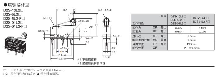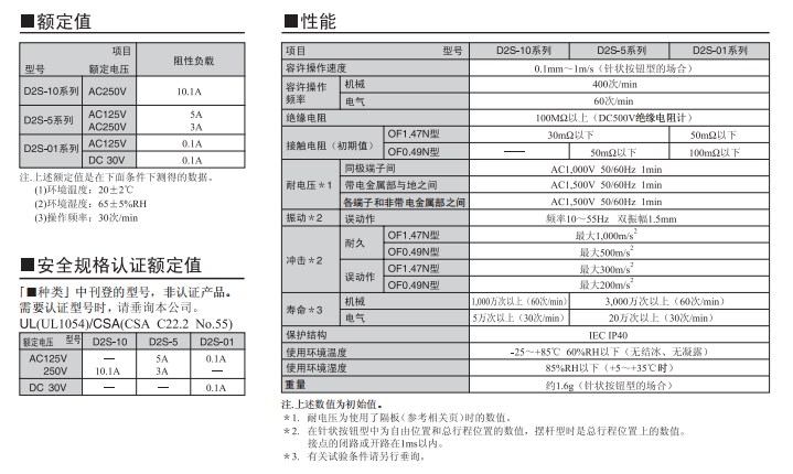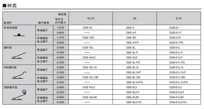 具有較好的耐焊劑性的超小型系列 焊劑無法進入的一體成型端子結構。 動作位置(OP)的精度高達±0.25mm,周邊設計和定位簡單。 采用了橫向操作中也能方便動作的針狀按鈕型。